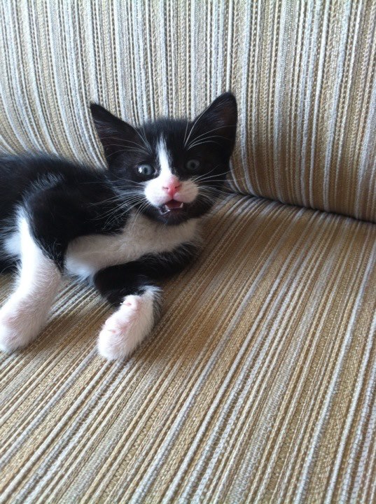In any case, I was walking my friend to the metro station near my apartment when we saw two kids (well, 18 and 19) on the corner. The guy had a box in his arms and when we came closer we saw two adorable, mewling, ridiculously tiny kittens! (pic) The guy had found them (and 3 others that they had already found homes for) in the park in the shade of a rock formation, and were trying to give them away. I ran home (quite literally, I was out of breath when I got there) and burst in the door to ask my mother if I could have a cat.